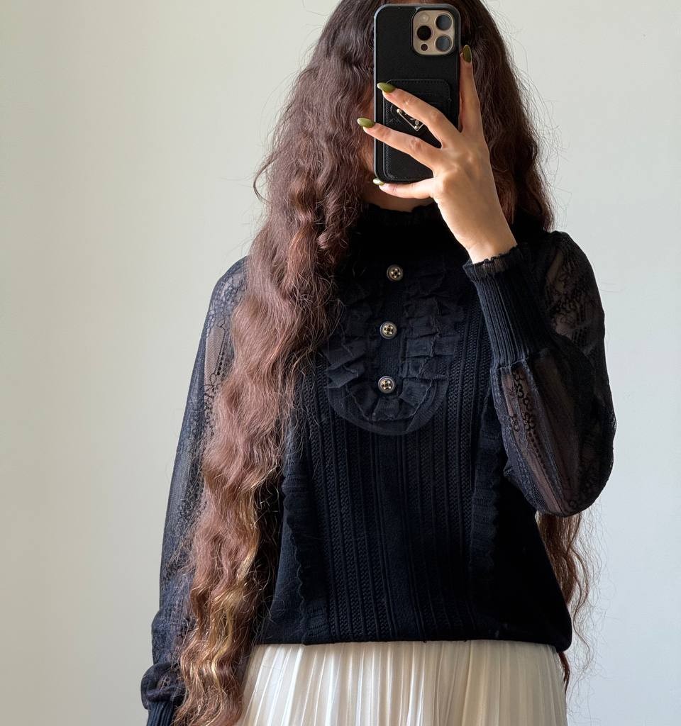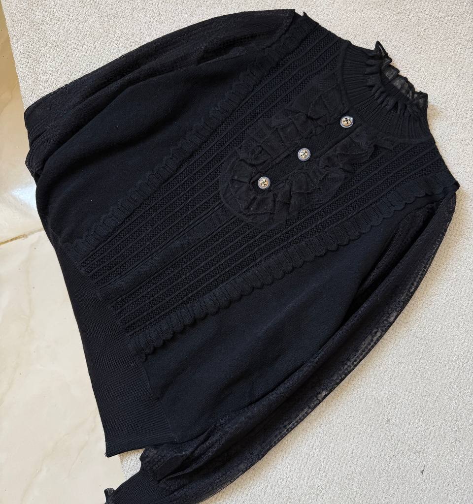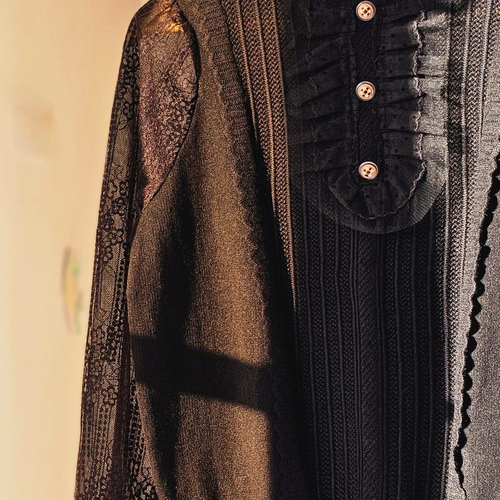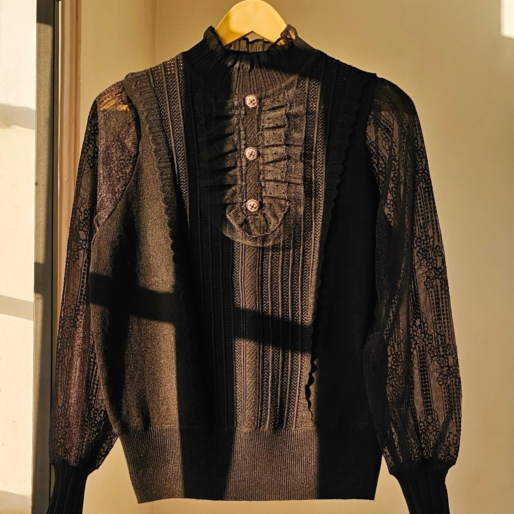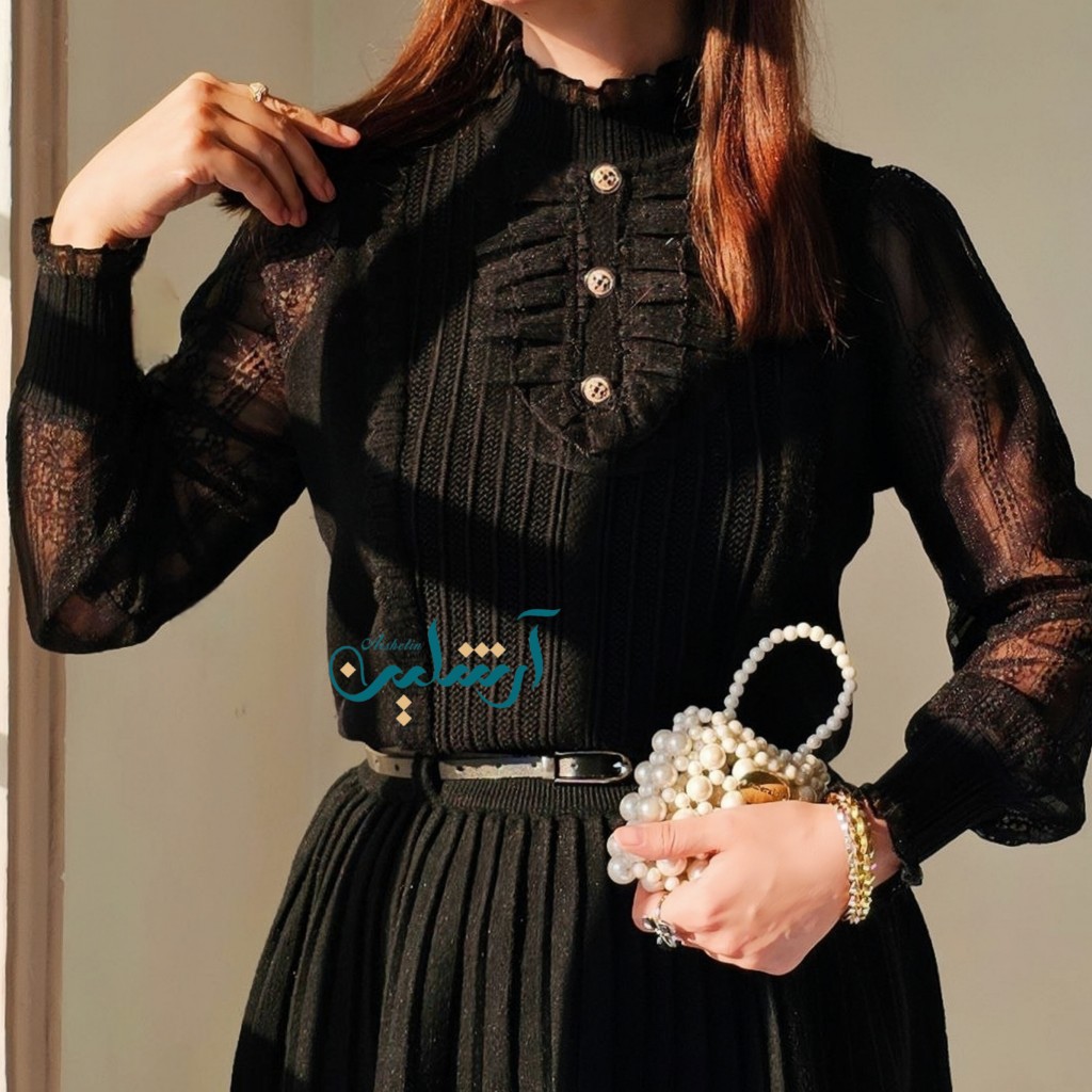 شومیز بافت مجلسی وارداتی،جلوی بافت طرح سوزنی، باضخامت متوسط گرم و سبک، آستین شومیز دو لایه گیپور و تور کار شده .