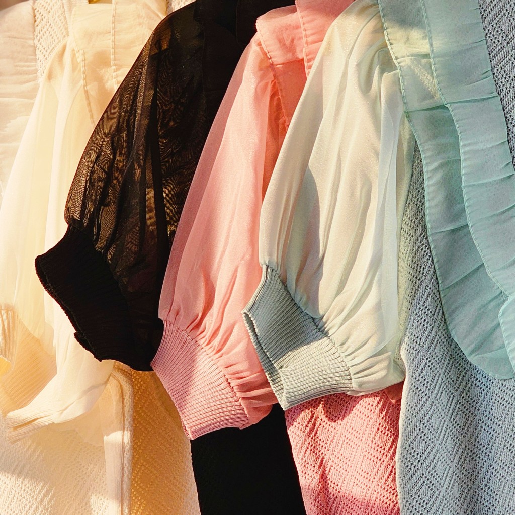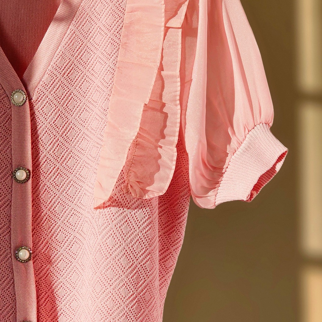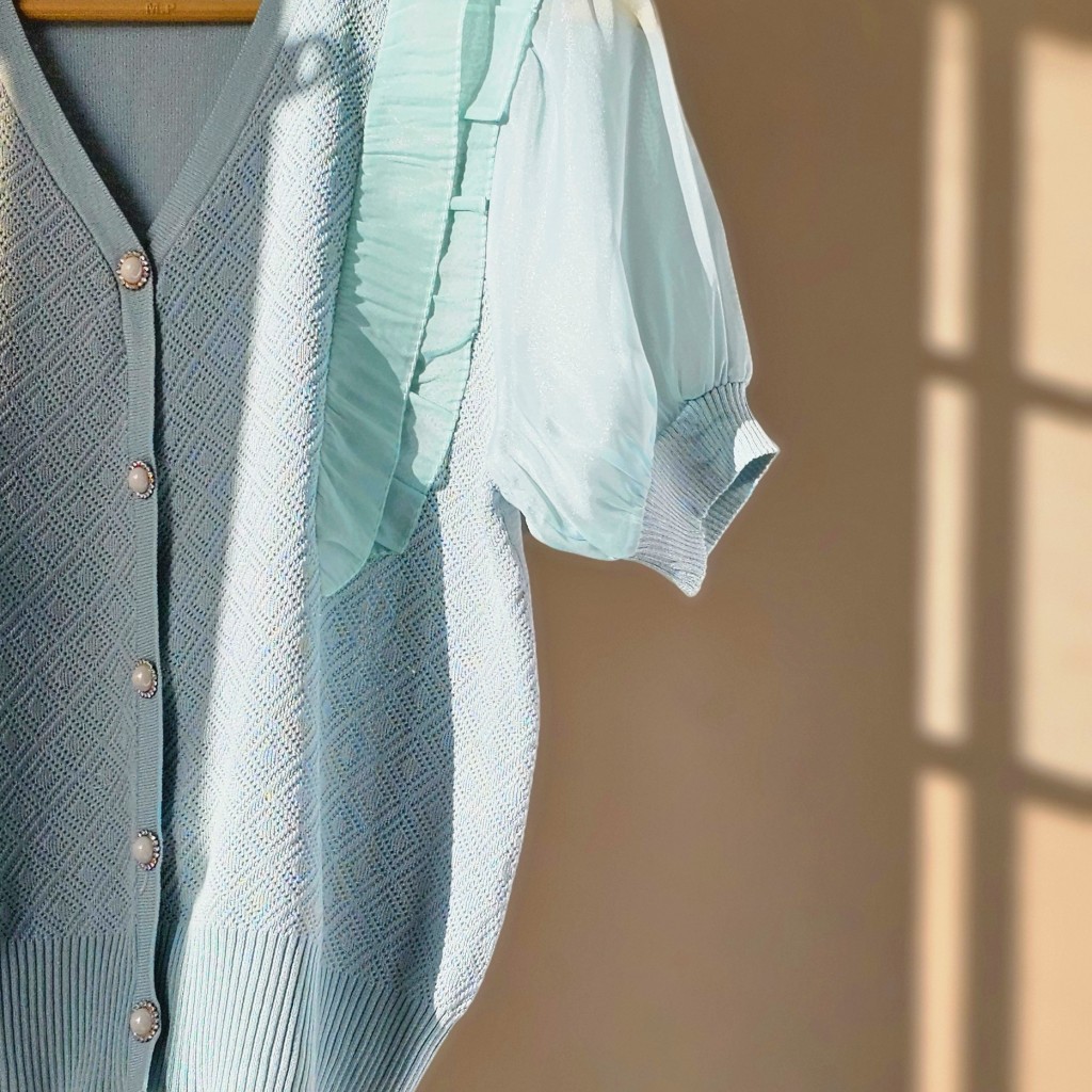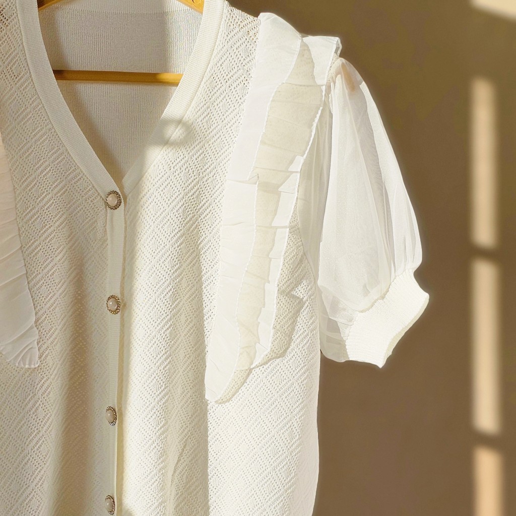 بلوز بافت کریستال سوزنی وارداتی،دکمه نما، آستین پفی حریر، جلوی بافت سوزنی، پشت بافت ساده ✨️