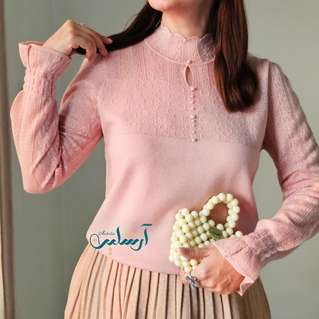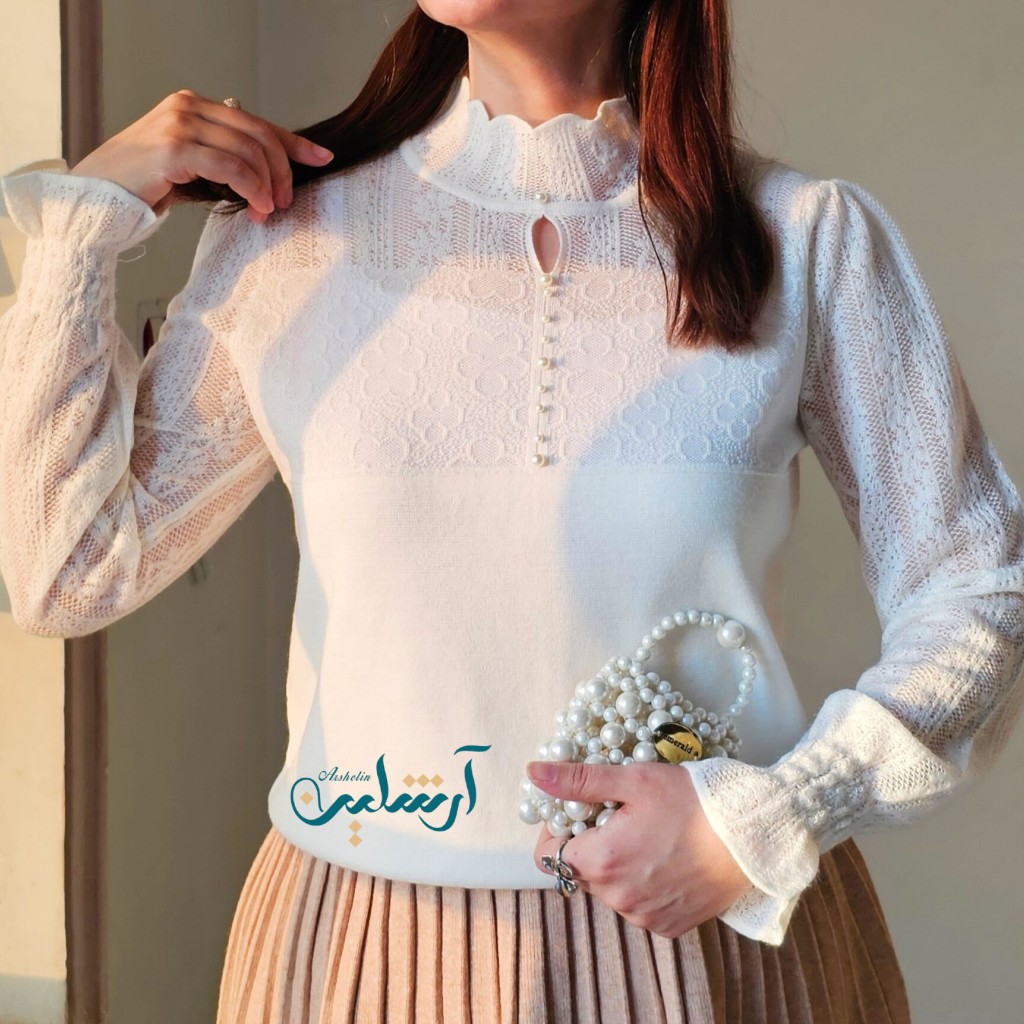 ✨️شومیز بافت ظریف و لطیف وارداتی با خرجکار گیپور،آستین ،یقه و بالای شومیز گیپور لطیفی کار شده، مرواریدها پانچ شده هستن✨️