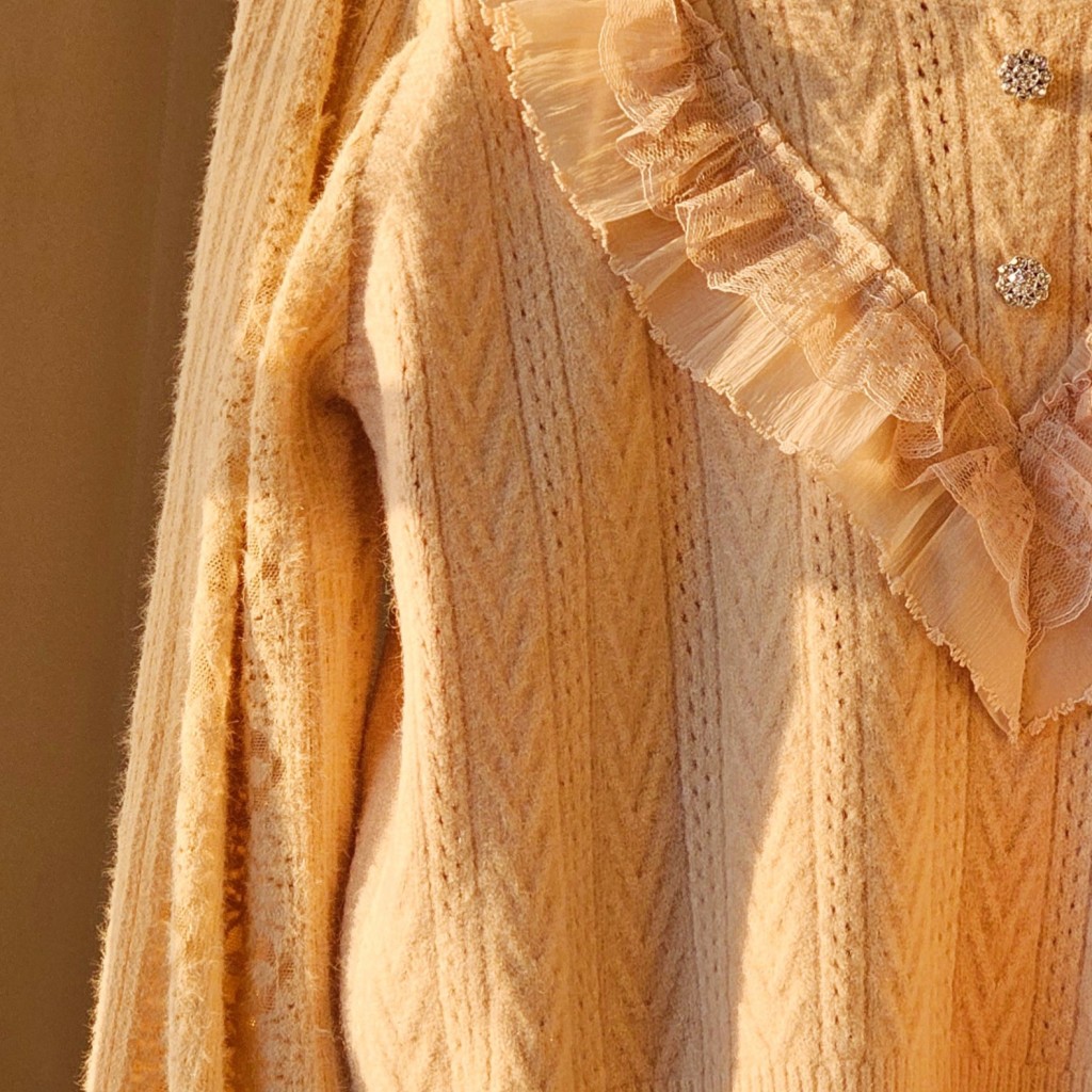 ✨️ پلیور بافت وارداتی،گرم ولطیف و بسیار باکیفیت،جلوی یقه دکمه تزیینی کار شده، آستین بافت گیپور موهردار✨️