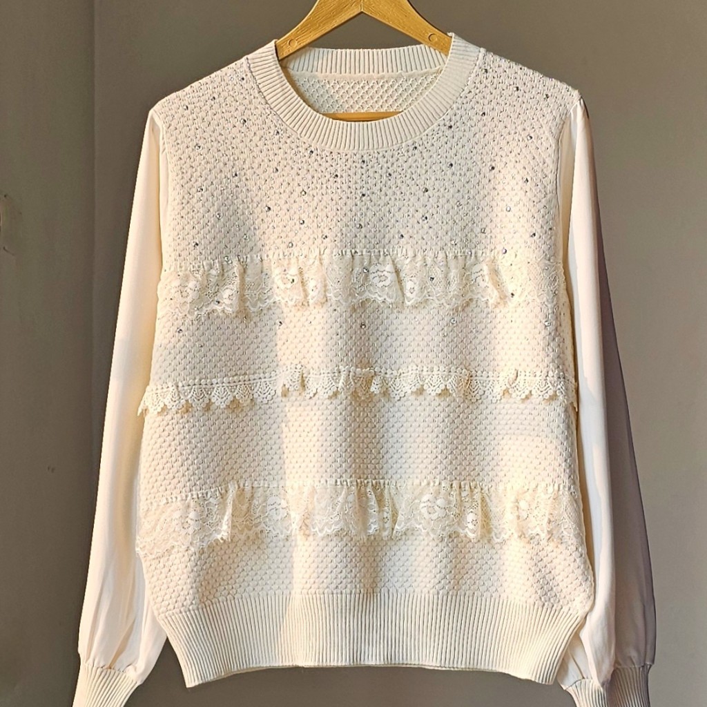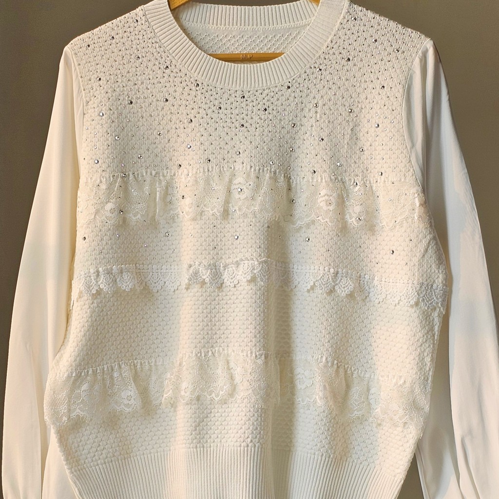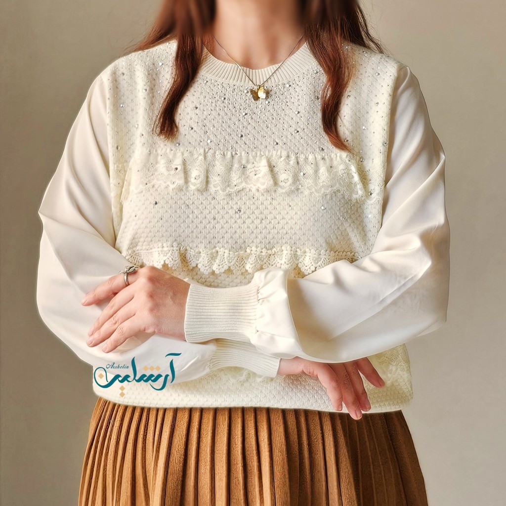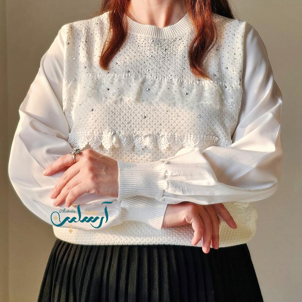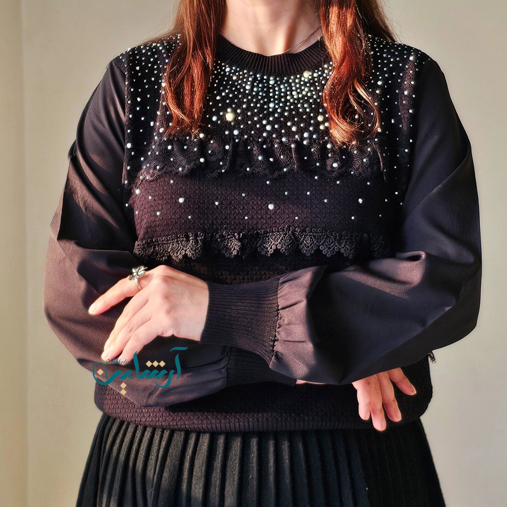 ✨️شومیز بافت مجلسی بسیار شیک وارداتی، جلوی شومیز چین کارشده، نگین های روش چسب شده هستن و محکم، بافت لطیف با آستین کرپ نخ،بدن نما نیست✨️