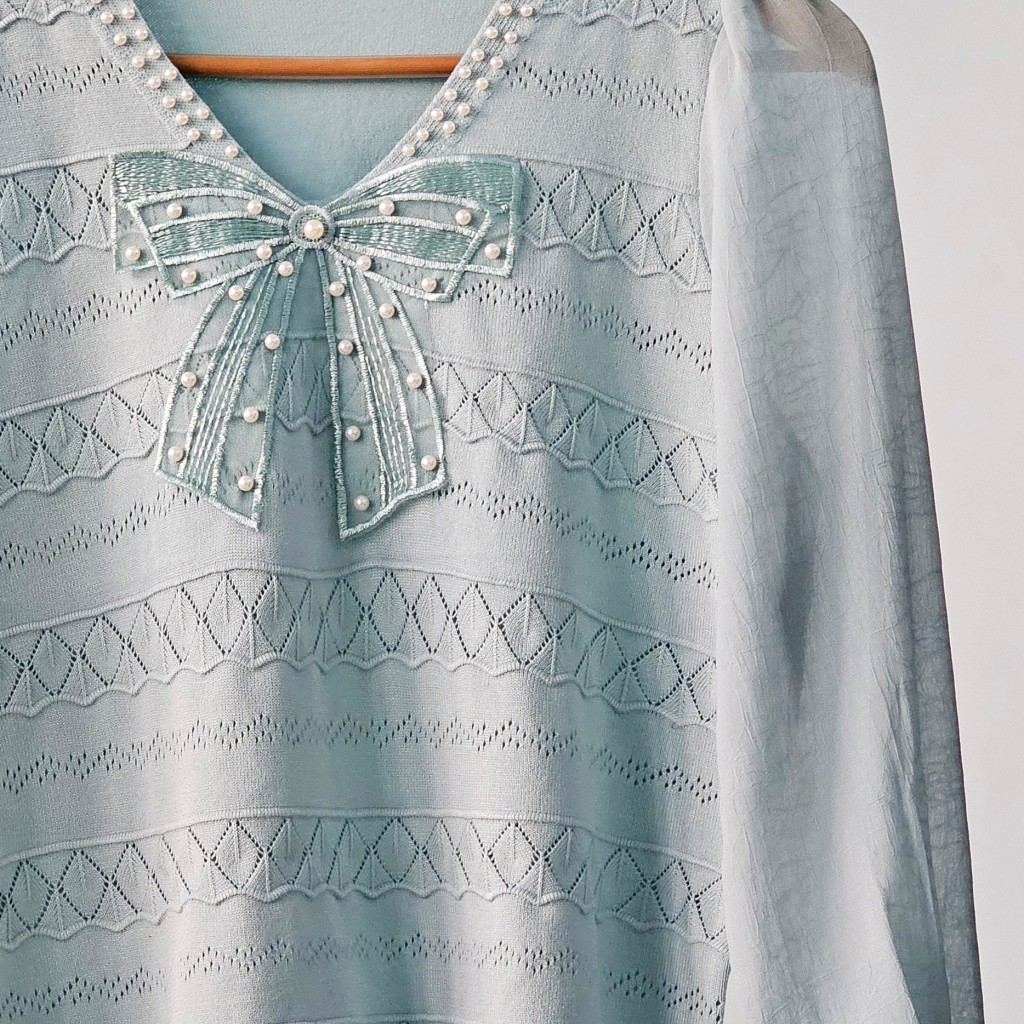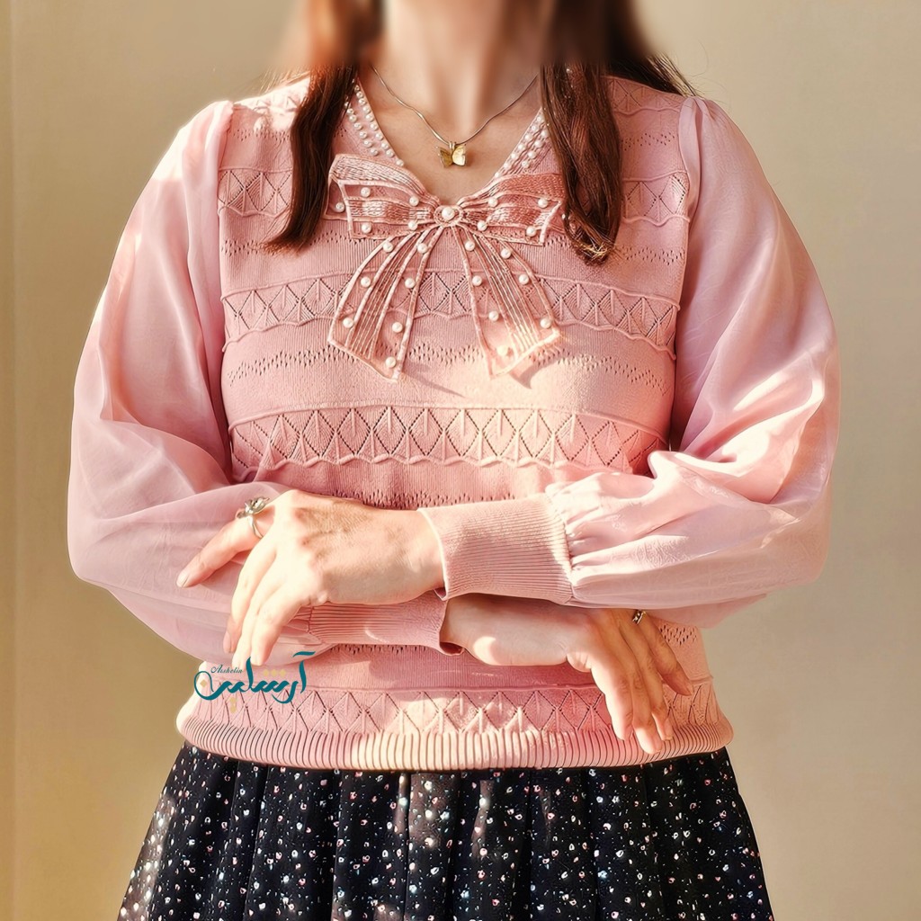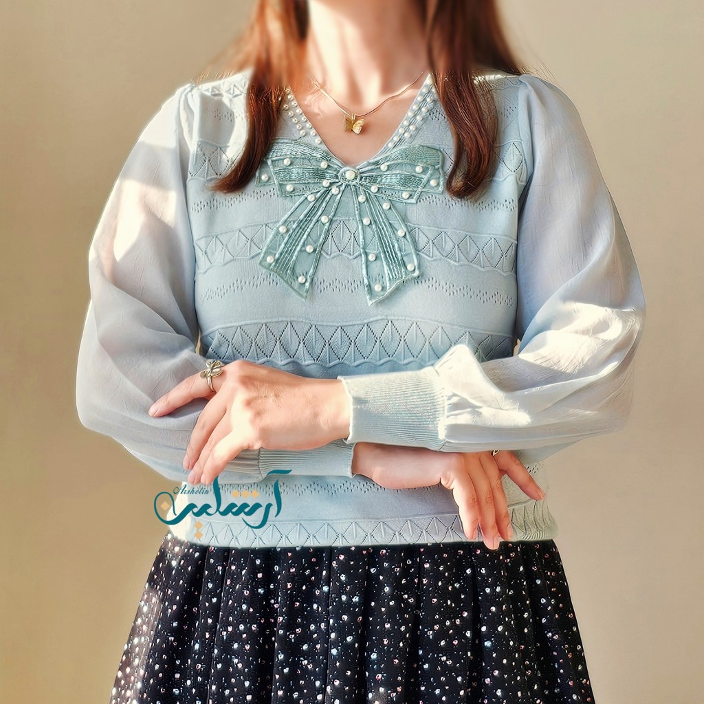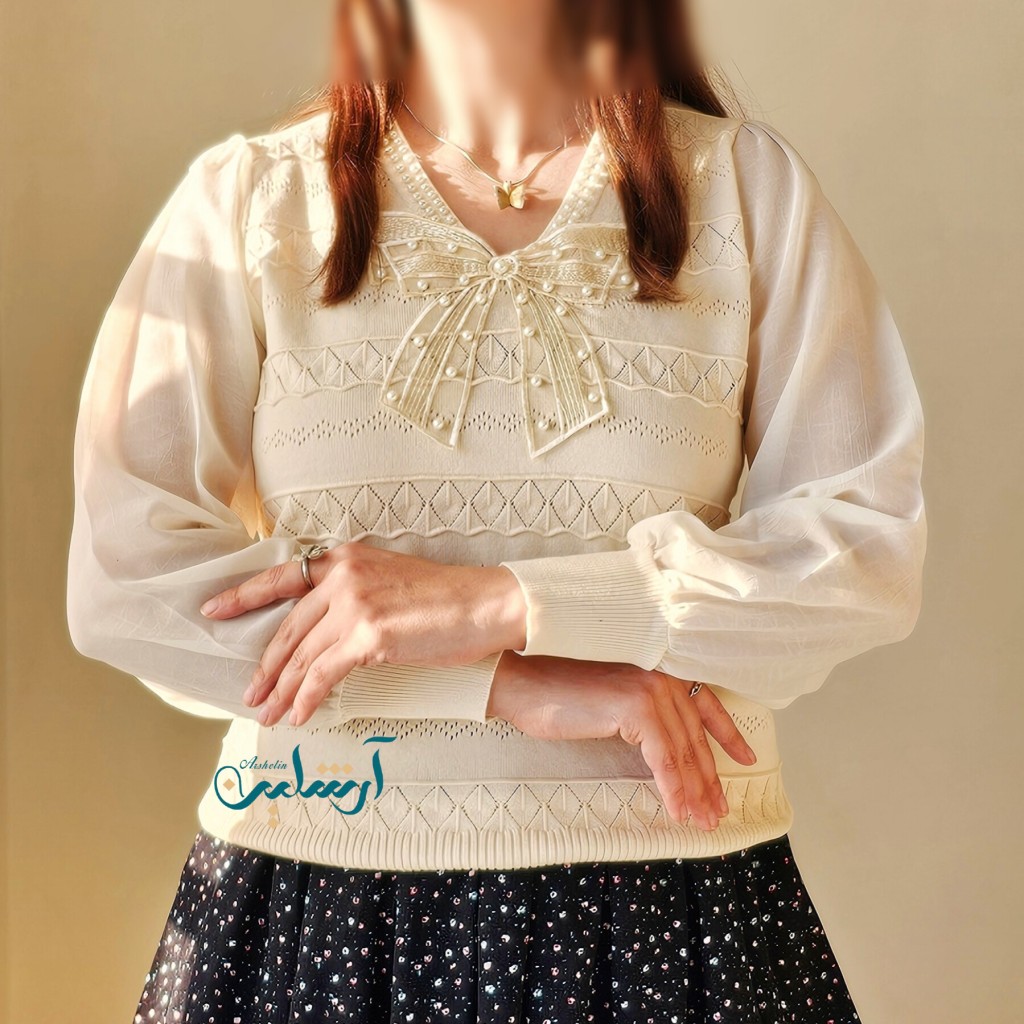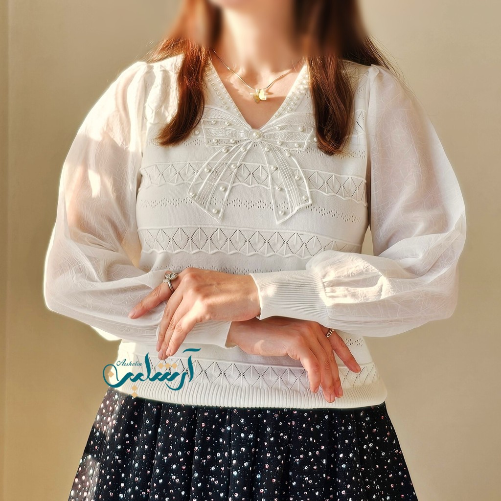 ✨️ ، شومیز بافت مجلسی و لطیف وارداتی و بسیار شیک، مرواریدهای روش پانچ شده هستن و ریزش ندارن، بافت کریستال سوزنی لطیف با آستین حریر✨️
