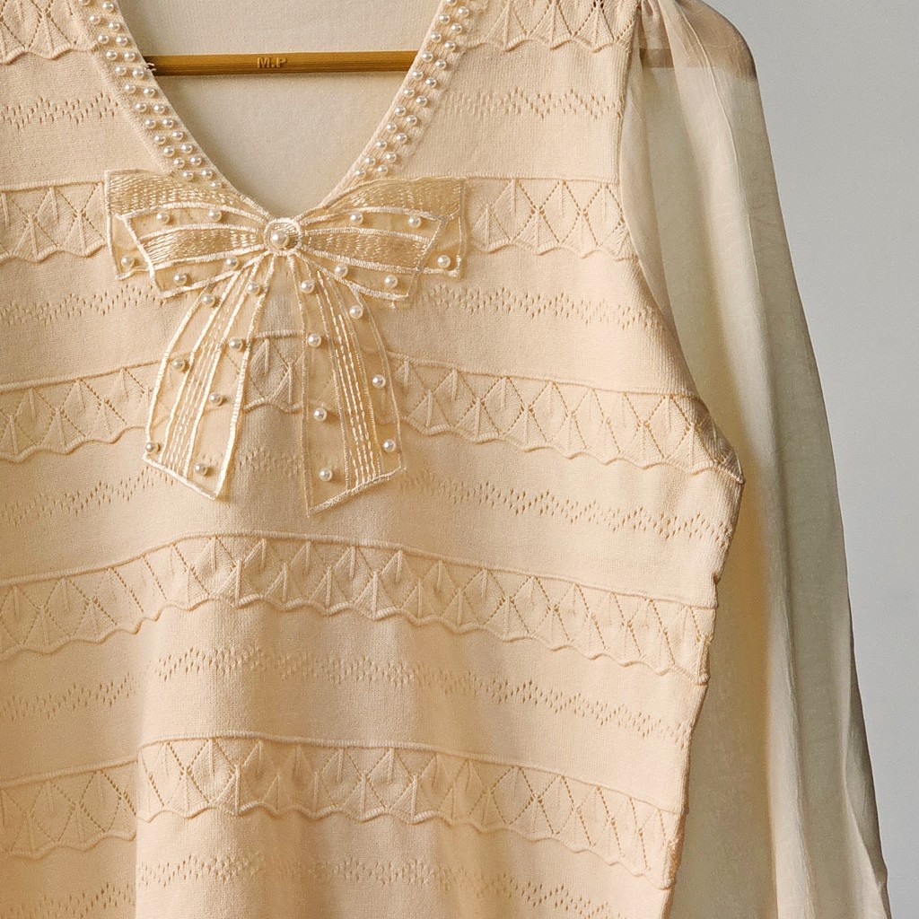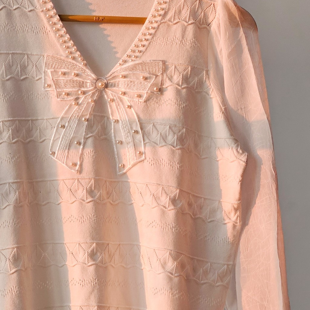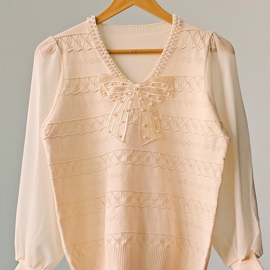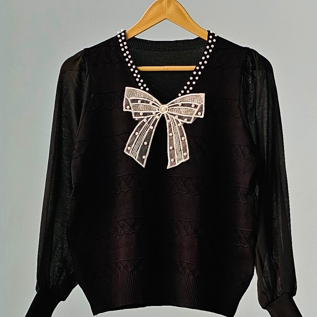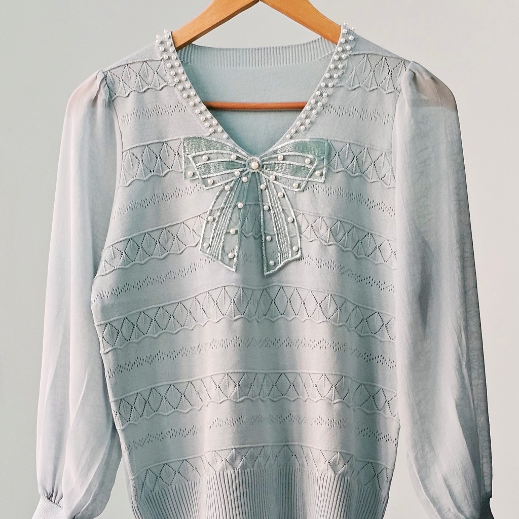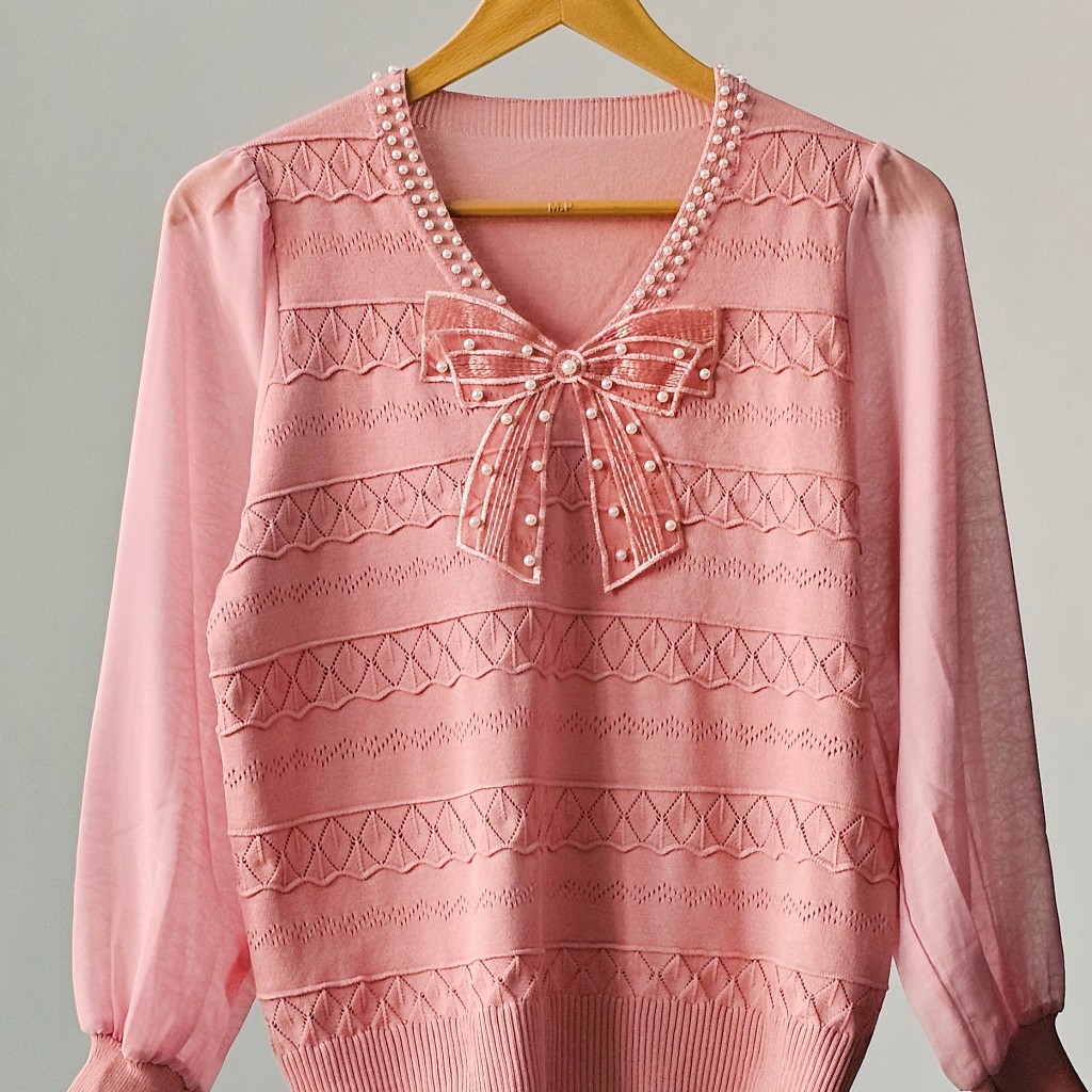 ✨️ ، شومیز بافت مجلسی و لطیف وارداتی و بسیار شیک، مرواریدهای روش پانچ شده هستن و ریزش ندارن، بافت کریستال سوزنی لطیف با آستین حریر✨️